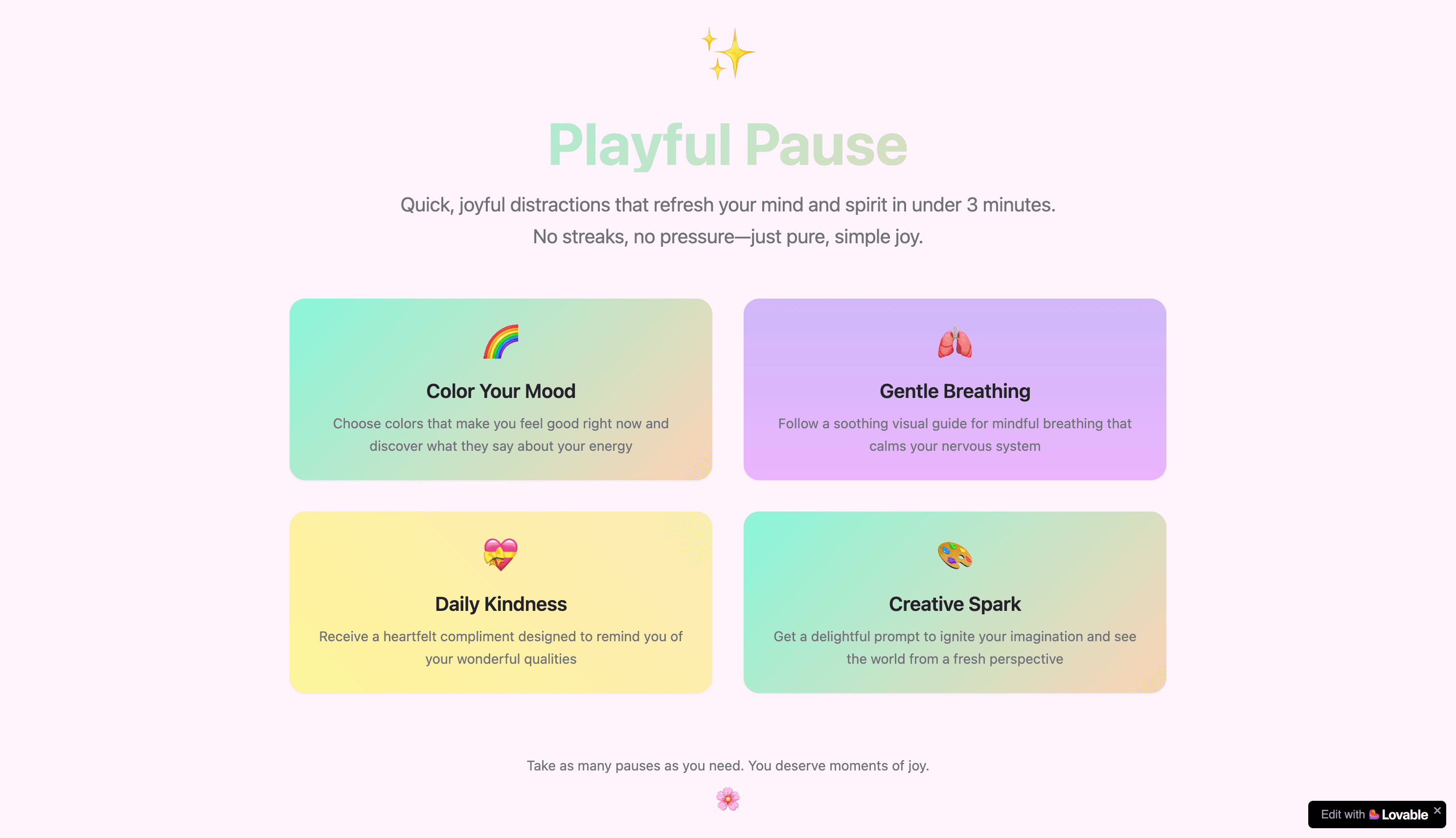 Playful Pause is a lightweight wellness experience designed to help users feel more relaxed in under three minutes.